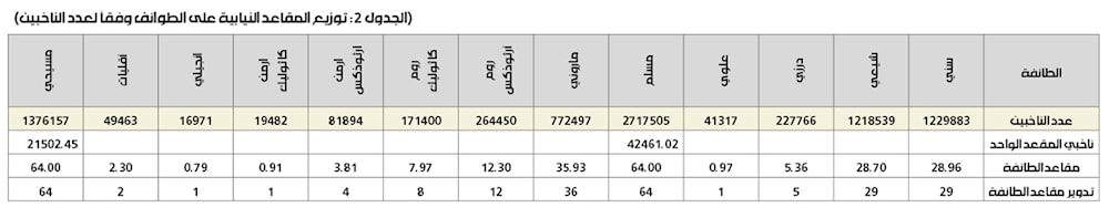 وبالتالي، فإن توزيع المقاعد على المذاهب، ينبغي أن يكون وفقاً للجدول الرقم 2.