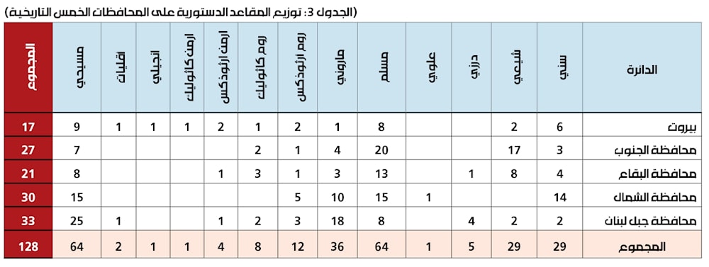 باعتماد المحافظات التاريخية الخمس، أي بيروت وجبل لبنان ولبنان الجنوبي ولبنان الشمالي والبقاع، ينبغي أن تتوزّع المقاعد النيابية على المحافظات الخمس وفق الجدول الرقم 3.