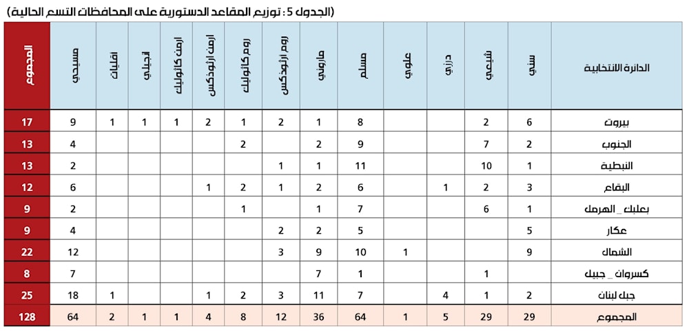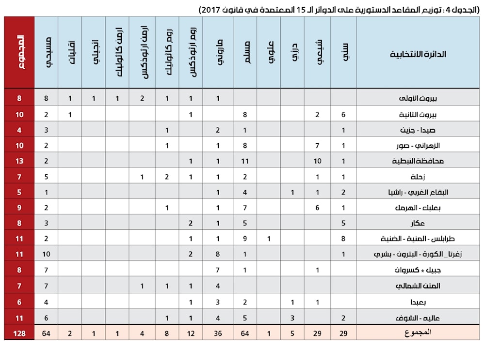 أما وفق الدوائر الانتخابية الـ 15 المعتمدة في قانون الانتخابات النيابية الصادر عام 2017، فيكون توزيع المقاعد على النحو الوارد في الجدول رقم 4.