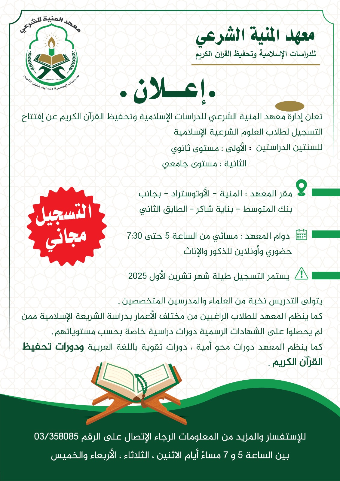 يعلن معهد المنية الشرعي للدراسات وتحفيظ القرآن الكريم عن افتتاح باب التسجيل للطلاب الراغبين في متابعة العلوم الدينية – قسم الشريعة الإسلامية للمرحلتين الثانوية والجامعية (السنة الأولى)، وذلك للعام الدراسي الجديد.